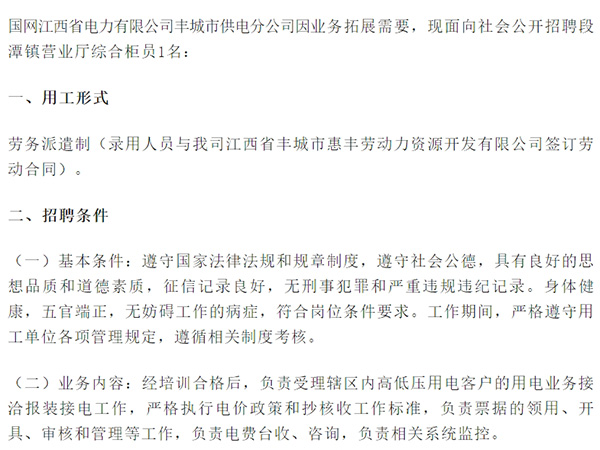 國網(wǎng)江西省電力有限公司豐城市供電分公司因業(yè)務(wù)拓展需要,現(xiàn)面向社會(huì)公開招聘段潭鎮(zhèn)營業(yè)廳綜合柜員1名:一、用工形式勞務(wù)派遣制(錄用人員與我司江西省豐城市惠豐勞動(dòng)力資源開發(fā)有限公司簽訂勞動(dòng)合同)。二、招聘條件(一)基本條件:遵守國家法律法規(guī)和規(guī)章制度,遵守社會(huì)公德,...